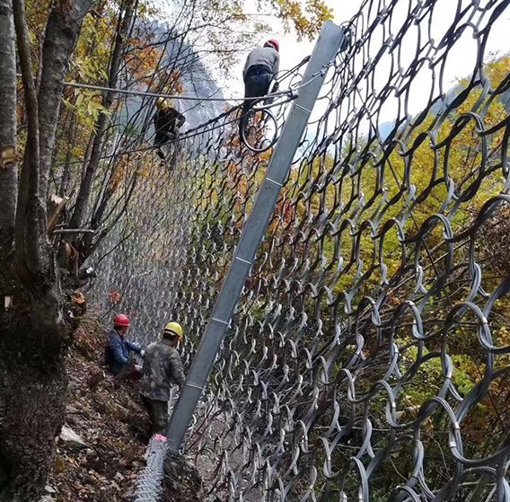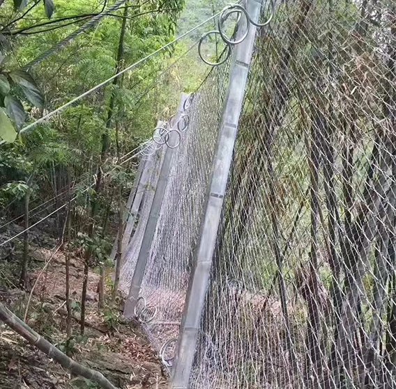 該防護(hù)系統(tǒng)的工作原理是通過(guò)鋼柱與鋼繩網(wǎng)之間的協(xié)同作用,在坡面上構(gòu)建起一道堅(jiān)固而富有彈性的防護(hù)屏障。一旦發(fā)生巖石崩塌,系統(tǒng)能夠迅速攔截下墜巖體,阻止其繼續(xù)滾落,從而保障下方人員與設(shè)施的安全。因此,RX-050型被動(dòng)防護(hù)網(wǎng)不僅具有安裝便捷、維護(hù)成本低的優(yōu)點(diǎn),還具備良好的環(huán)境適應(yīng)性與長(zhǎng)期穩(wěn)定性,是現(xiàn)代邊坡防護(hù)工程中廣泛應(yīng)用的一種高效解決方案。