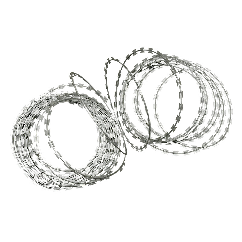 刀片刺繩(razor barbed wire),又稱(chēng)為刀片刺絲或刀片刺網(wǎng),是一種近年來(lái)廣泛應(yīng)用于各類(lèi)安全防護(hù)領(lǐng)域的新型高強(qiáng)度防護(hù)材料。它由高強(qiáng)度金屬帶材沖壓成鋒利的鋸齒狀刀片,并通過(guò)高張力鋼絲串聯(lián)而成,形成一種具有強(qiáng)烈威懾力和高效阻隔功能的防護(hù)結(jié)構(gòu)。與傳統(tǒng)鐵絲網(wǎng)相比,刀片刺繩不僅在物理防御性能上更為優(yōu)越,而且在外形設(shè)計(jì)上也更加美觀大方,因此被越來(lái)越多地應(yīng)用在各種安全要求較高的場(chǎng)所。
